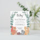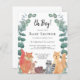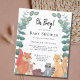 Die kleine Kinderdusche ist mit Waldtieren und Eukalyptuspflanzen dekoriert. Es steht "Oh Junge!" in stylischer Schriftzeichen. Niedliche Waldfreunde Fuchs, Raccoon, Igel, Hasen und Eichhörnchen sitzen zusammen. Original Wasserfarbe © Michele Davies.