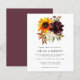 Un joli bouquet d'automne d'un tournesol jaune, de pivoines violettes et d'hydrangées blanches surplombe ce faire-part de mariage moderne. Il fait partie de la collection Tournesol et Bourgogne.