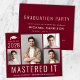 Eine preisgünstige bordeauxrote Master-Abschluss-Abschluss-Ankündigung und Party Einladung mit einer 4-Foto-Collage, "Mastered It" in großen weißen Buchstaben und seine oder ihre Klasse Jahr, Name und Uni oder Universität in der einfachen weißen Typografie. Auf der Rückseite fügen Sie die Details der Graduierungsparty hinzu.