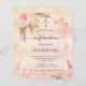 Eine Rose Gold, rot rosa rustikale Imitate metallisch aussehen Hintergrund. Die Einrichtung besteht aus Rose-Gold und rosa Blumen, Rose, Pampas-Gras, Schmetterlingen und einem goldenen Kreuz. Personalisieren und fügen Sie einen Namen und die Details.