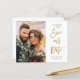 Ein modernes, sauberes Foto Ankündigung Datum freihalten mit Kalligraphie-Skript rette unsere Datums-Nachricht. Klicken Sie auf die Schaltfläche Bearbeiten, um dieses Design anzupassen.