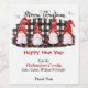 Diese Weinflaschen-Etiketten sind mit vier kleinen weißen Bartomen versehen, die saisonale Grüße bringen. Jede der Zwerge ist in einem anderen roten und weißen Muster auf ihren hohen Weihnachtsmannmützen gekleidet. Die Bilder werden auf einem karierten Büffelhintergrund in Schwarz/Weiß platziert. Scattered Schneeflocken treiben um sie herum. Der Schriftzeichen "Frohe Weihnachten" ist in Weiß über ihnen, und "Happy New Year" ist unten. Ihr benutzerdefinierter Text ist unten in Schwarz und Rot.