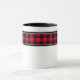 Cette tasse de café en céramique est montrée avec une jolie impression de plaid de buffle noir et rouge et deux rayures d'accent noir. Customisez cet objet ou achetez tel quel. image stock freepik.com all-free-download.com