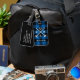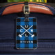 Gepäckumbau, der gekreuzte kräuselnbesen im Weiß auf kariertem Hintergrund des blauen Büffels kennzeichnet. Vervollkommnen Sie für Lockenwickler und kräuselnfans. Personifizieren Sie mit Ihrem Name und Anschrift.