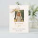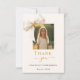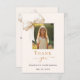 Eine moderne und elegante Bestätigung danke Ihnen Karte für ein Mädchen. Ein weicher, cremefarbener Hintergrund, der mit einem großen Bogen verziert ist. Schwarze und goldene Buchstaben. Auf der Vorderseite den Text: Danke, Foto, Name und ein Datum. Zurück: Vorlage für Ihren Dank Notiz und Name.