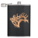 Diese einzigartige "One of a Kind" Bull Elk Flask! Es verfügt über eine Bugling Bull Elk Wood Silhouette auf einem schwarzen Lederhintergrund! Dies ist ein Original Art Design von Künstler Kerry Miller. Viel Spaß!