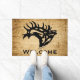 Personalisieren Sie diese einzigartige "One of a Kind" Bull Elk Door Mat! Es verfügt über eine majestätische Bugling Bull Elk Black Silhouette..auf einem Stresswald Hintergrund! Original Kunstmalerei des Künstlers Kerry Miller.