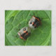Paire d'accouplement de deux pucerons tachetés sur une feuille verte profondément veinée. Les insectes noirs gris et rouges peuvent s'essouffler.
