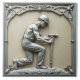 An Art Deco bas-relief sculpture of a male construction worker, around 30 years old, wearing a hard hat, jeans, and suspenders, kneeling and holding a large hammer. The sculpture is silver and set against a beige background, framed by an ornate silver border.
