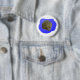 Ein Knopf mit einem Foto eines jungen Afrikanischen Bullfrogs, der in einem digital geschaffenen blauen See sitzt.
