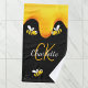 Un arrière - plan noir élégant et de jolies bourdons souriants. Décoré avec du miel doré doux qui dégouline. Personnalisez et ajoutez votre nom et vos initiales monographiques, en lettres dorées et blanches. Le nom est écrit avec un script de style écrit à la main. Parfait pour votre maison d'été !