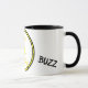 Lächelnde handbemalte Hummel, die hallo mit gelben schwarzen Streifen und flatternden Flügeln schwingt. Buzz ist in schwarzem Text auf beiden Seiten der Tasse geschrieben. Der Hintergrund ist knusprig weiß. Der Rand ist kreisförmig in schwarz mit schwarzen Punkten auf gelbem Hintergrund dargestellt. Die Küche ist sehr schön für den Frühling oder Sommer. Spaß für alle, die Bienen Lieben. Original Graphic Artwork © TamiraZDesign. www.zazzle.com/tamirazdesigns