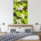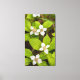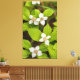 Das Bild zeigt eine nah-up-Ansicht mehrerer Brombeerensorten mit jeweils fünf Blättern, eingebettet in lebendige grüne Blätter. Die Blume haben ein zartes, fast durchsichtiges Erscheinungsbild, mit einem zentralen Haufen kleiner, braun-gelber Muster. Die Blätter sind ein üppiges Grün, das mit markanten Venen durchzogen ist. Der Hintergrund ist leicht verschwommen, was auf eine natürliche Umgebung schließen lässt.