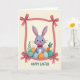 This greeting card features a pastel lavender 🐰 with a small smile, rosy cheeks, and a neat scarlet bow tie, standing as the sweet focal point of the scene. Around it sit decorated eggs in teal, sky blue, and warm orange, with stripes, dots, and light textures that feel like little gifts arranged for someone special. A plump orange carrot and fresh green sprigs peek out from behind the eggs, adding a garden touch that suggests a shared spring stroll with a close friend. The illustration is framed by a pink stitched ribbon border, with tiny bows at each corner that echo a gentle, affectionate attention to detail. The background is creamy ivory, giving the soft colors plenty of room to stand out without feeling busy. A short Easter greeting appears near the top in a light pink tone, centered above the framed artwork, with smaller text tucked neatly near the bottom edge. 🌷 The eggs cluster at the rabbit’s feet, and the pink ribbon frame forms an even rectangle around the whole scene.