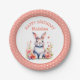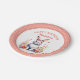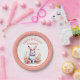 Ein süß-kleines Hasen umgeben von rosa und korallenfarbenen Blume Aquarell illustriert personalisierte Geburtstagsparty Papier Teller für ein kleines Mädchen.