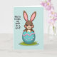 This card features an adorable, human-like bunny peeking out from a cracked turquoise eggshell 🐰. The bunny’s large dark eyes and rosy cheeks give it a tender, friendly look, as if it’s sharing a private joke with whoever’s holding the card. Its long ears have soft pink inner shading, and its brown fur is dotted with lighter spots that add gentle texture. The eggshell is decorated with a wavy bubblegum-pink stripe and scattered pink circles, making the shell feel festive without being busy. A small tuft of green grass sits beneath the shell with a soft shadow, grounding the scene in a simple spring setting 🌷. On the left side, the riddle text “What is invisible, and smells like a carrot?” appears in a friendly, easy-to-read style in dark lettering against the pale background. The background stays a smooth, pale sky-blue, letting the bunny and egg colors stand out clearly.