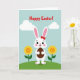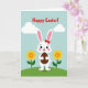 This card shows a cute white bunny standing front and center on a rolling green hill, smiling with rosy cheeks and a gentle, friendly look 🐰. Soft pink details color the inside of its tall ears and its paws, and a small red bow sits neatly on top of its head, adding a sweet, affectionate touch. The bunny holds a smooth brown egg close to its chest, like it’s carrying a small gift meant for someone special. Above the scene, the words “Happy Easter!” appear near the top in bright red lettering, easy to read against the sky. A light blue background sets a calm spring setting, with two rounded white clouds floating behind the bunny 🐇. Two simple yellow flowers sit on either side of the character, as if they’re leaning in to keep it company. The egg has slight shading that makes it look gently rounded, while the hill curves in a single green wave beneath the bunny’s feet.