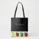 Taschentasche des Spaßlehrers getan im Schwarzen, mit einem weißen Band, entlang der Unterseite, mit Gelb, Grün und roten Äpfeln. Weißer Text ist bereit, für selbst oder für Ihren Lieblingslehrer zu personifizieren.