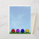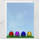 Happy Oaster Illustration mit farbenfrohen bemalten Ostereiern im Gras mit dem blauen Himmel im Hintergrund.