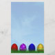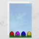 Glückliche Ostern-Illustration, die bunte gemalte Ostereier im Gras mit dem blauen Himmel in der Rückseite kennzeichnet.
