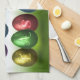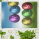 Moderne farbenfrohe Osterdarstellung mit metalischen Stilfolien, gefärbte Ostereier mit "Happy Oaster"-Schriftzeichen auf einem Federhimmel.