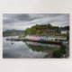 Puzzle des Fotos mit den bunten Fischereihafenhäusern von Portree Stadt, mit Reflexion im ruhigen Wasser des Meeres auf der Insel von Skye in Schottland, Großbritannien.