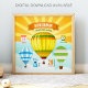 Poster zur Geburtsankündigung für das Babyzimmer mit moderner Typografie und süßen Heißluftballons vor einem strahlenden Sonnenaufgangshintergrund. Fügen Sie alle Ihre liebsten Details in diese einfache Vorlage ein, um Ihren eigenen einzigartigen Geburtsstatistik-Poster zu erstellen.