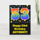 Die Front dieses Aufregens, Spaßes und vibrierenden GeburtstagsgrußkartenAusrüstungsbeschreibungen ein buntes Sternfeld inspirierte Muster, zusammen mit der Nr. "53", ein mehrfarbiges Regenbogenspektrum wie Steigungsmuster, auf einem Schwarzes farbigen Hintergrund habend. Die Front kennzeichnet auch eine Geburtstagsgrußmitteilung, einschließlich einen kundengerechten aufnahmefähigen Namen. Die inneren Eigenschaften eine kundenspezifische Geburtstagsgrußmitteilung oder konnten möglicherweise geklärt werden und verlassener freier Raum, wenn eine Mitteilung eigenhändig stattdessen geschrieben werden soll. Eine personalisierte Geburtstagskarte so wäre möglicherweise eine Spaßweise, Geburtstagswünsche zu schicken jemand, das ihren dritten Geburtstag fünfzig feiert. [~Z0000348]