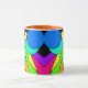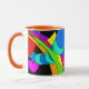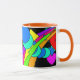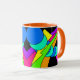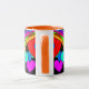 Das 2. von 4 schön, bunte Tassen. Der Entwurf ist der Herzen, der Regenbogen, der Punkte und mehr in hellem, Spaßfarben auf einer schwarzen Platte ein abstraktes. Der Griff und das Innere sind orange.