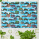 Dieses Tuch hat verschiedene Arten der Autos und Wohnwagen auf einem blauen Wasser entwerfen Hintergrund. Ich habe unterschiedlichen Entwurf mit diesen bunten einzigartigen Fahrzeugen.