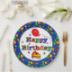 Herzlichen Glückwunsch zum Geburtstag Party Papier Teller mit den Hauptfarben Rot, Blau, lila, Gelb und Orange Konfetti, Ballon und Geburtstagstorte.