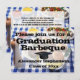 Sommerzeit Hinterhof Grillen Abschlussfeier Einladung. Frische Hamburger, Ketschup, Senf, Shiskebobs vom Grill. Blau-weiß karierte Tischdecke.