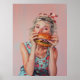 Gemälde eines frechen Mädchens in einem Erdbeerkleid, das riesige Burger isst