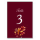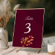 Fügen Sie Ihrem Empfang mit dieser Hochzeit im Herbst Tischnummer Card eine stilvolle saisonale Touch hinzu. Dieses Design mit seinem bordeauxfarbenen Hintergrund und den blühenden Herbstblättern in Aquarelltönen eignet sich ideal für rustikale oder elegante Hochzeiten im September, Oktober oder November. Kühle Nummerierung und klassische Typografie machen das Sitzen einfach und schön.
