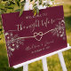 Das elegante Dinner-Zeichen der Probe mit seinen Bordeaux-Tönen, zarten goldenen Blumenakzenten und einem romantischen Herzmotiv empfängt Sie stilvoll. Dieses individuell gestaltbare Schild verleiht Ihrer Feier eine persönliche und raffinierte Touch.