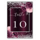 Ein tiefburgundischer Hintergrund, mit Imitaten verziert mit silberem Glitzer, Glitzern und rosa und burgudny Blume. Weißer Text. Personalisieren Sie Ihre Tischnummern und fügen Sie sie hinzu. Fügen Sie Ihre Nummern eins nach dem anderen hinzu.