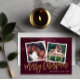 Günstige, individuell bedruckte Urlaubskarten mit einfachen Vorlagen für die Anpassung. Dieses elegante Design zeichnet sich durch ein 2-Foto-Collage-Layout aus, das mit Imitaten aus goldenen Blattgold auf einem abstrakten bordeauxfarbenen und goldenen Hintergrund gestaltet wurde. Personalisieren Sie es mit Ihren Fotos, Familiennamen, dem Jahr oder anderen benutzerdefinierten Texten. Bitte beachten Sie, dass die Goldfolie der Imitate Teil des bedruckten Designs ist - die Karten haben keine echte metallische Folie. Die Rückseite hat Platz für zusätzliche Fotos und Texte. Verwenden Sie die Designtools, um die Schriftartes und Farben zu ändern, mehr Fotos hinzuzufügen und ein einzigartiges Urlaubsfoto-Design zu erstellen.