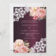 Für eine elegante und romantische Hochzeit. Ein tiefburgundischer Hintergrund mit rosa und Rose goldenen Blumenmustern, Rose und Spitzen. Personalisieren Sie Ihre Namen und Details und fügen Sie diese hinzu.
