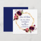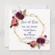 Eine elegante und romantische Hochzeit Speichern Sie die Date-Karte. Ein geometrisch geformter Rahmen in goldfarbenem Rahmen mit Bohemischen, boho-farbenen Rose, Blume in Bordeaux und Rosa. Vorlagen für Ihre Namen, Datum und Ort der Hochzeit. Weißer Hintergrund vorne. Marinebriefe Zurück: marineblau farbener Hintergrund.