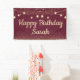 Maßgeschneidertes "Happy Birthday" Banner mit goldenem Glitzer und Streichleuchten auf elegantem bordeauxfarbenem Hintergrund. Personalisiert mit dem Namen des Ehrengast.