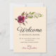 Fügen Sie diese spezielle Willkommenskarte hinzu, um Geschenke für Ihre Gäste aus der Stadt zu empfangen. Diese Hochzeitskarte bietet eine schöne bordeauxfarbene Blume und eine grüne Umgebung auf cremefarbenem Hintergrund. Die stilvolle Aquarellgrafik erscheint oben auf der vertikalen Einladung. Benutzerdefinierter Text erlaubt es Ihnen, Ihrer Familie und Ihren Freunden eine persönliche Willkommensnachricht hinzuzufügen.
