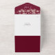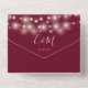 Alles in einer Hochzeitseinladung mit hübschen Saitenlichtern, Mauerkirschen, Signaturstil-Namen und schicker Typografie auf bordeauxrotem Hintergrund. Die Einladung enthält eine perforierte RSVP-Karte mit QR-Code. Entwickelt von Thisisnotme©
