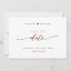 Verkünden Sie Ihre Hochzeit mit dieser schönen Hochzeit speichern Sie die Datumskarte. Moderne handgeschriebene Skriptdetails in bordeauxfarbenen Imitate-Folien sowohl vorne als auch hinten. Zurück mit einzigartiger Save the Date Briefmarke/Monogramm mit Paarnamen. Sauberer und einfacher Stil. Weiß und bordeauxfarben. Bereich für Hochzeitswebsite, weitere Informationen oder/und Nachrichten für Ihre Gäste (z.B. "Kann es nicht warten, Sie dort zu sehen!").