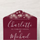 Alles in einer modernen minimalistischen Hochzeitseinladung mit hübschen Saitenlichtern und eleganten Signatur-Script-Namen und Monogramm-Initialen auf bordeauxrotem Hintergrund. Die Einladung enthält eine perforierte RSVP-Karte. Entwickelt von Thisisnotme©