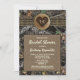 Burlap + Chasse Camo Bridal Shower Invitations - présente un arrière - plan de camouflage de chasse imprimé avec des éléments design de burlap et de ficelle. Une zone de burlap brun imprimée contient le texte. Une tranche de rondelle imprimée avec un coeur brûlé se trouve sur la ficelle. Vous pouvez "graver" les initiales dans le coeur en modifiant le texte de démonstration.