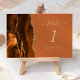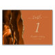 Der links Rand dieser eleganten, modernen Hochzeitskarte mit einer farbenfrohen, orangefarbenen Tischnummer, die mit einem vergoldeten Imitat-Glitzer bestickt ist. Der anpassbare Text kombiniert beige Handschrift, kursiv und kopperplate Schriftart auf einem verbrannten orangen Hintergrund.