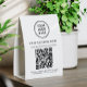 Promote your brand and make customer interactions effortless with this custom QR code paper table tent sign, perfect for salons, spas, restaurants, boutiques, medical offices, hotels, and small businesses. Designed to display your logo, business name, and scannable QR code, this clean and modern tabletop sign helps guests or clients quickly view your services, menu, prices, or booking link with just one scan. Printed on durable, affordable paper, it’s a professional yet budget-friendly option for front desks, counters, or trade show displays. The minimalist black-and-white design ensures your logo and QR code stand out clearly, complementing any brand style or décor. Easily personalize with your own logo, address, phone number, website or other text to create a cohesive, on-brand customer experience that looks polished and inviting.
