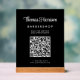 Modernes, schwarzes Acryl-Tischschild mit Ihrem Namen in einer stilvollen weißen Schrift und Geschäftstyp in schlicht weißer Schrift. Geben Sie Ihre Website-Adresse ein, um einen skalierbaren QR-Code für Kunden und Kunden zu erstellen, um Ihre Produkte, Dienstleistungen, Stunden usw. anzuzeigen.