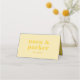 Eine schicke, kühne Typografie nimmt den Kuchen mit diesen modernen Hochzeitsfeiern Platzkarten. Eine lustige Überraschung kommt durch, denn die Unterseite ist hell und fröhlich gelb, mit dem schmetterlichen weichen Gelb im Hintergrund und Text.