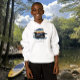 A pair of loons on the lake with a sunset in behind the and cattails on either side of them. On the back is a map of Butterfield Lake Redwood N.Y.
